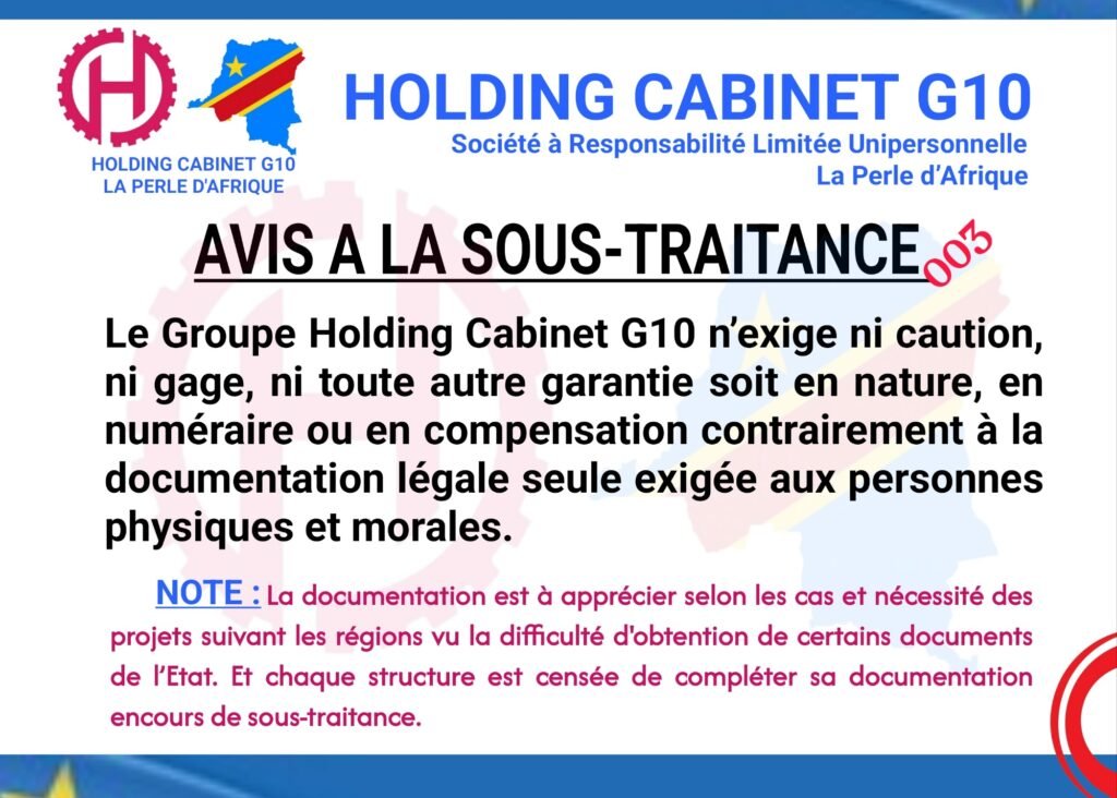 La société Groupe Holding Cabinet G10 a émis un avis général à la sous-traitance qui va de fin de l’année 2025 et fin de l’année 2026 signé en date de 14 novembre 2025. Les conditions légales sont scindées suivant la forme juridique de chaque partie : La plus grande condition est celle d’être d’avance une personne physique ou morale d’origine congolaise. La documentation exigée : 1. Personnes physiques [entrepreneurs]– Lettre brève demande de sous-traitance fixant un domaine au maximum avec un montant estimatif du projet 2. Personnes physiques commerçantes [Etablissements]– RCCM– IDNAT – NIF – Nº CNSS– Nº INPP– Nº ONEM– Nº EDD 3. Personnes morales [Sociétés]– Statuts notariés – Acte de dépôt des statuts au greffe – Pv notarié des dirigeants – Acte notarié – RCCM– IDNAT– NIF– Nº INPP– Nº ONEM– Nº EDD– Nº CNSS – Nº ARSP 4. Personnes morales [Asbl, Ong, Ongd, Ongdh, Coopératives, Synergies] – Statuts notariés – Acte notarié – Pv notarié des dirigeants– Arrêté du Ministre National de Justice et Garde des Sceaux – Arrêté du Ministre National ayant le secteur d’activité 5. Personnes morales [Organismes Internationaux] – Traité – Acte de l’assemblée générale nommant les dirigeants 6. Marchés publics ou privés à courte durée d’exécution [Personnes physiques ou morales] – Contrat officiel signé entre parties